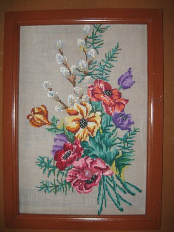 1) Картина вишита крестиком, розмір полотна 40 на 60 см, з рамою 46 на 66 см. Рама дерев"яна, пофарбована і полакована, в одному місці є невеликий брак. Картина під склом. Ціна 360 грн. |