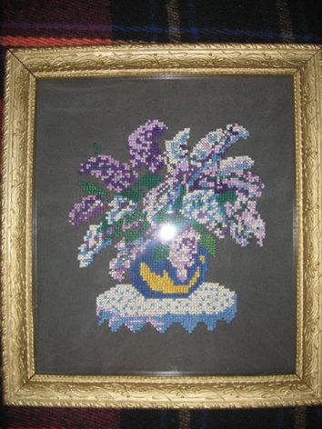 4) Картина "Дівчина збирає виноград". Під склом. Відреставрована дерев"яна рама: пофарбована, полакована, покрита напиленням золотистого кольору. Сама рама важка. Розмір картини без рами 177 на 274 хрестики, або 50 на 63 см, з рамою 65 на 78 см. Ціна 999 грн. без торгу. 5) Картина "Букет бузку" . Не нова. Розміри 48 на 44 см. з рамою. Під склом. Рама офарбована золотистим напиленням. Ціна 120 грн. |