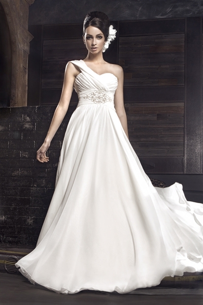 Сукня молочного кольру з шифону 36-го розміру (регулюється корсетом), оздоблення - розкішна брош з кааміння Swarovsky та вишукана бретель через плече, прикрашає її невеликий елегантний шлейф, який регулюється. Сукня після чистки у Відмінному стані. |