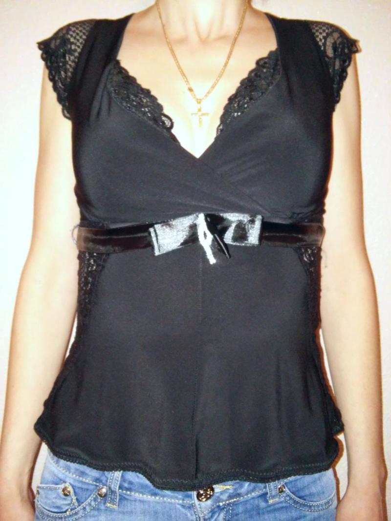 Нарядна блузочка. Розмір м. Довжина 54 см. Дуже приємна до тіла. Взаді зав'язується на стрічці. |