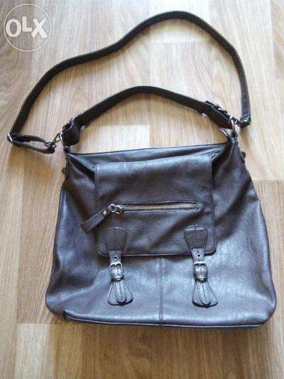 Шкіряна сумка темно-коричневого кольору у хорошому стані. Дуже вмістка, має один великий відділ всередині з багатьма карманчиками і меншими відділами. Також є карманчики спередіиі взаді. Можна носити як на короткій ручці, так і на довгій. |