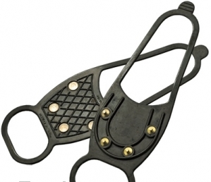 Приспособление для ходьбы в гололёд "Зимняя подкова" изготовлено в виде съёмных подошв из высококачественной эластичной резины, на нижней поверхности которой выступают небольшие стальные шипы